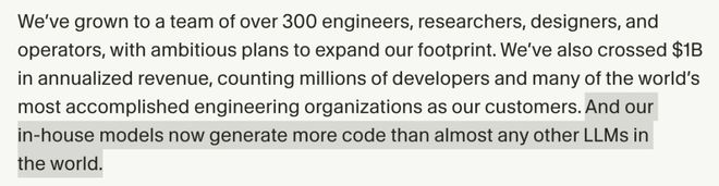 就代码生成量而言,Cursor内部生成的代码,几乎超过全球所有其他LLM总和。